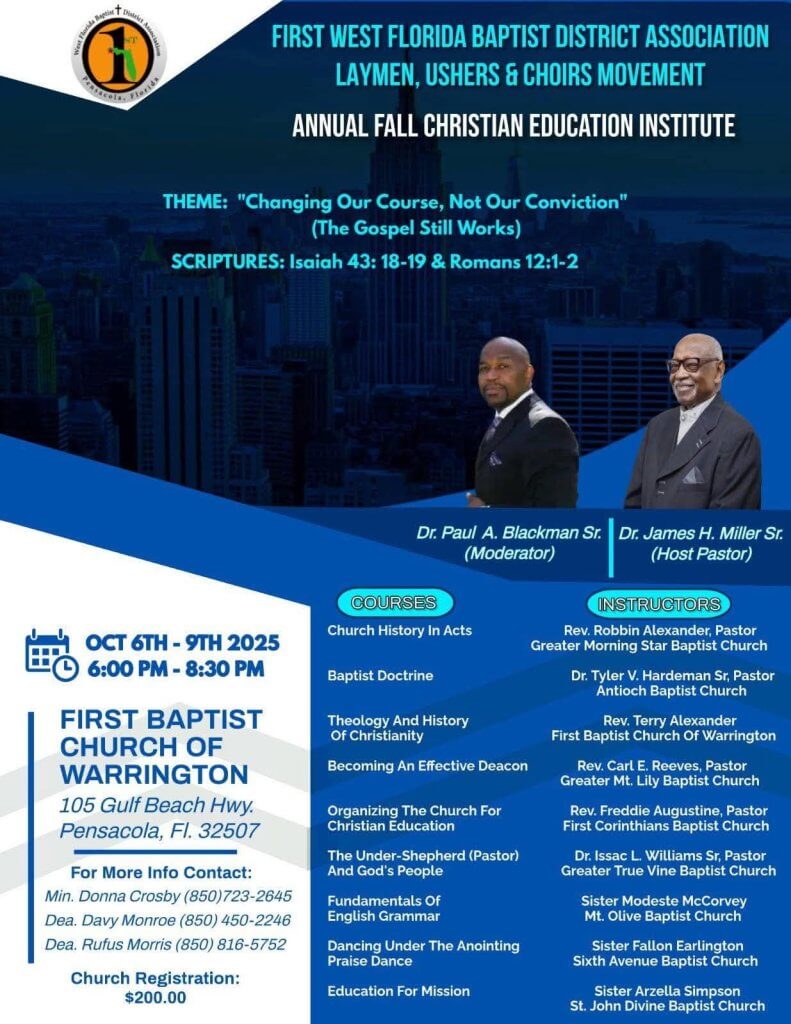 4. ANNUAL FALL CHRISTIAN INSTITUE. To those of you who are interested, First West Florida Baptist District Association will be offering biblical classes Monday (October 6th) through Thursday (October 9th) at First Baptist Church of Warrington Florida from 6pm to 8:30pm nightly, check out our website or our SJDPensacola App for more details.