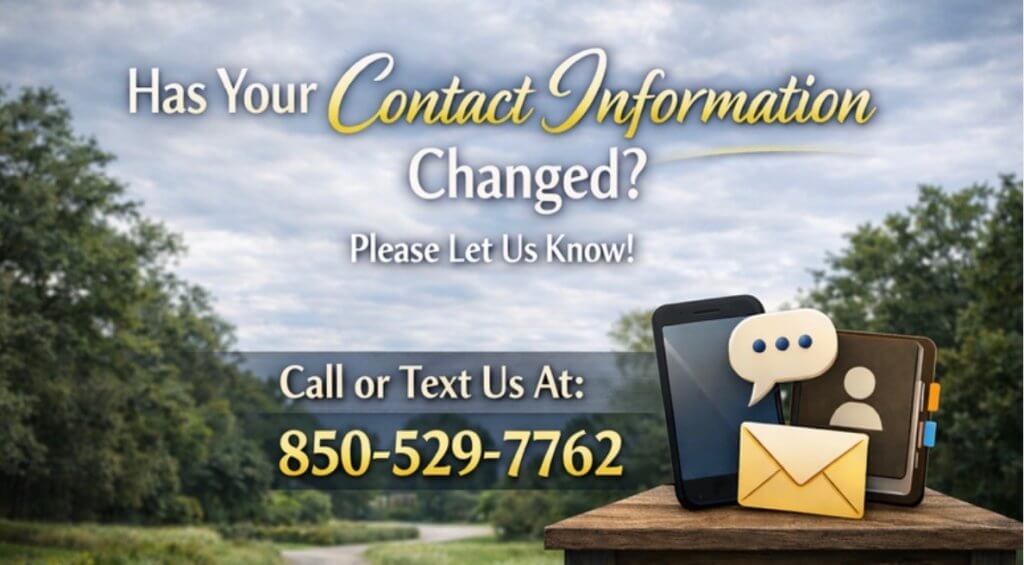 8. HELP US SERVE YOU BETTER IN FEBRAURY. SO we can better serve you, We are asking all members of S J D to take the time and update your contact information, there are 3 very EASY ways you can choose from to update your contact information. You can simply text your name and updated contact information to 850 529 7762, that’s 850 529 7762, OR you can simply email your updated contact information to our secretary at secretary@sjdmbc.org, that’s secretary@sjdmbc.org, or you can simply call the church office ANY hour at 850 432 0568 and simply leave your contact information on our voicemail, again, asking every member of S J D to please take the time to choose one of these three options and update your contact information, thank you for helping us serve you better here in 2026.